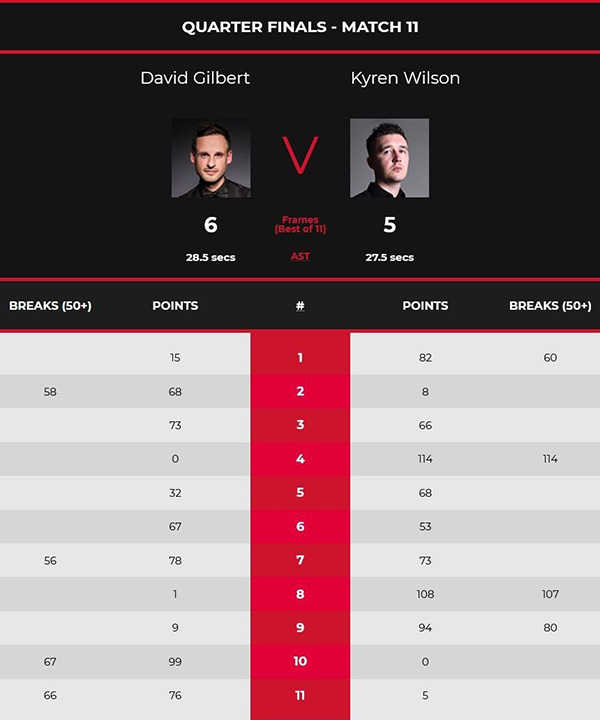 第七局,吉尔伯特单杆56分,以78-73清台逆转,4-3再度领先。第八局和第九局,凯伦-威尔逊连续轰出单杆107分和80分,以108-1和94-9再下两局,5-4反超获得赛点。第十局吉尔伯特一杆得到67分,以99-0拿下追回赛点。决胜局吉尔伯特把握住机会,一杆拿下66分以76-5胜出,总比分6-5逆转凯伦-威尔逊,连续两年杀进大师赛四强。