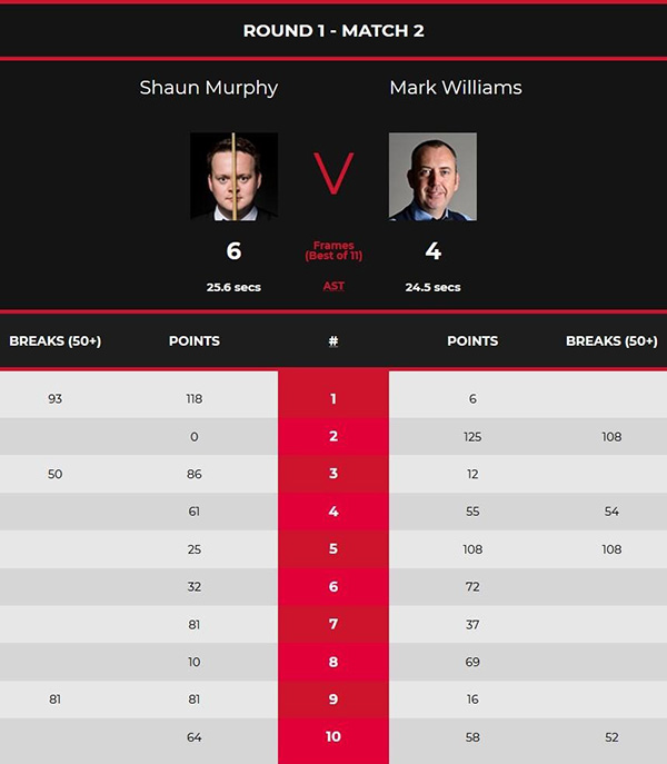 首局比赛中,开局阶段墨菲迅速进入状态,特别是长台保持了极高的准度,经过开局阶段缠斗后墨菲长台上手,随后打出单杆93分超分制胜,取得1-0领先。第2局中威廉姆斯迅速做出回应,上手围球打出单杆108分破百,总分追成1-1平。