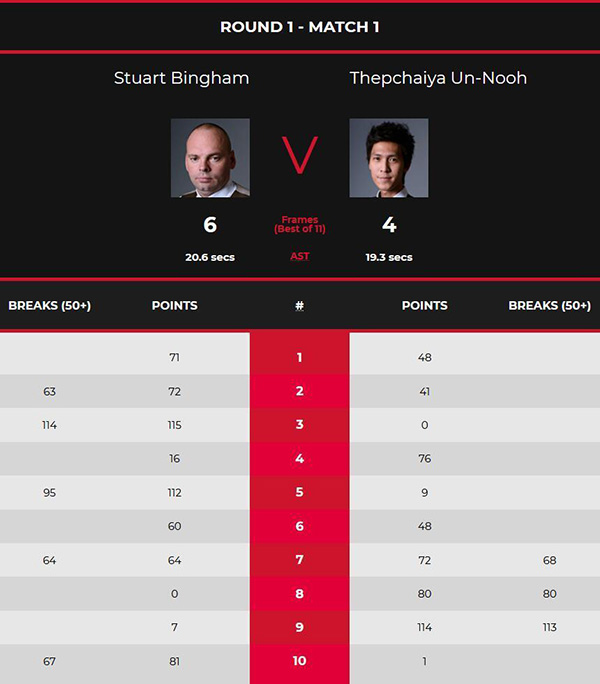 首局比赛中,宾汉姆打进一杆超远台进攻,但随后简单顶袋黄球没能打进,塔猜亚的围球机会连得48分后转入防守。宾汉姆一杆42分缩小分差,防守争夺中塔猜亚拼中袋小角度失误,宾汉姆再度上手超分拿下这局1-0领先。第2局比赛中,宾汉姆围球连得9分失误,塔猜亚此后又一次打丢绝佳的围球机会,连得41分后再中袋再次出现失误,宾汉姆接管局面一杆63分超分制胜,总分来到2-0领先。