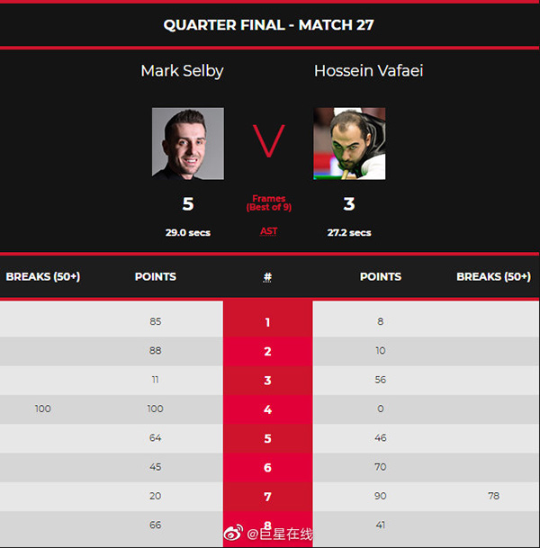 在塞尔比和瓦菲的比赛中,两个人的发挥都不是很好,整场比赛给人的感觉比较压抑。在首局比赛中,塞尔比以85:8拿下此局比赛的胜利取得1-0的领先。第二局,塞尔比再次多次上手拿到88分以88:10拿下此局取得2-0的领先。第三局,瓦菲多次上手拿到56分以56:11拿下此局将比分改写为1-2落后塞尔比。第四局,塞尔比轰单杆100分零封对手取得3-1领先。