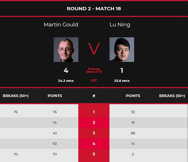 第一局古尔德手感不错,单杆76分、76-32大胜,1-0迎来了开门红。第二局,两人连续得分能力都不是太强,古尔德74-19再下一城。第三局,鲁宁顶住了压力,88-40还以颜色,扳回了一城,大分追到了1-2。