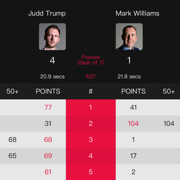 本场比赛,特鲁姆普4-1威廉姆斯,1/4决赛将战李行,赛后特鲁姆普表示:“在家休一天就感觉充好电了。本赛季几乎每项赛事我都进了四强,不知以前有人做到过没,我打得挺好再给自己一次冲冠机会也好。回看英锦赛决赛,打丢的那颗粉球难度比我当时以为的高得多,打进蓝球太激动,打粉球草率了,但都过去了,就让它促使自己变更强吧。”