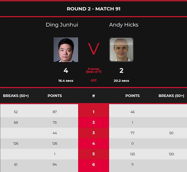 第五局,希克斯125-1扳回一局,将比分追至2-3,第六局,丁俊晖上手后,开始冲击147,不过在33分后,打黑球失误,不过对手架杆也出现失误,丁俊晖最终拿下比赛晋级下一轮。