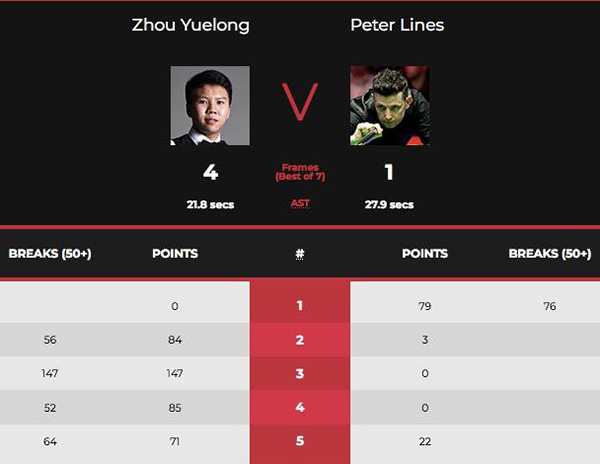 轰出满分的周跃龙状态没有太大波动,随后第4局中继续保持着准度,上手围球连得52分建立优势,随后零敲碎打85-0超分拿下这局,总分3-1来到赛点。第5局中,莱恩斯上手拿下22分中断,随后周跃龙掌控了主动权,围球单杆64分拿下这局胜利,总分4-1周跃龙获胜挺进第二轮。