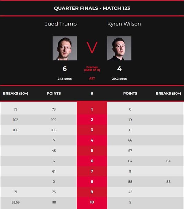 第九局,威尔逊1分防守,特鲁姆普没有解到留下机会,威尔逊单杆24分失误,特鲁姆普单杆71分超分红球袋口,特鲁姆普单杆4分拿下。特鲁姆普5-4赛点。第十局,特鲁姆普单杆63分,威尔逊5分失误送上袋口红球,特鲁姆普55分清台拿下比赛。