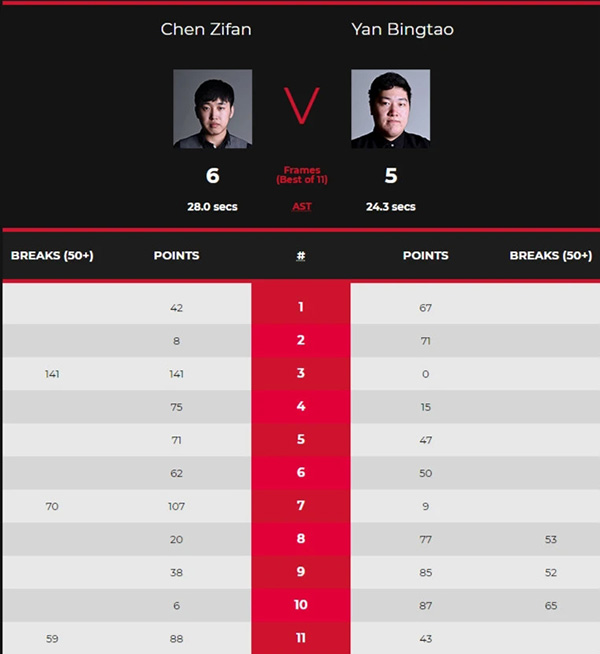 决胜局,颜丙涛依旧非常顽强,陈子凡则拒绝崩盘,他的单杆59分制胜,88-44锁定胜局,总比分6-5获胜晋级。