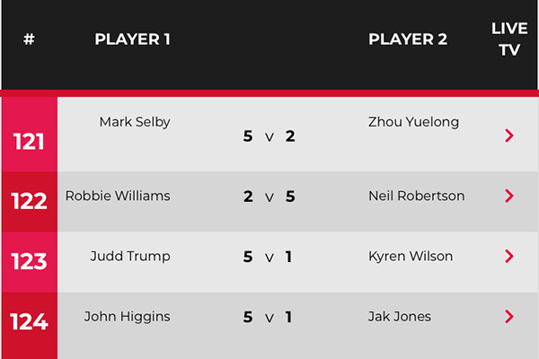 局间休息后,第5局威廉姆斯在乱局争夺中获得机会,彩球争夺上不断拼进,61-51超分拿下这局,扳回一局总分2-3落后。第6局罗伯逊长台上手围绕黑球进攻,打进4红4黑后叫位失误中断,威廉姆斯长台失误再度送礼,罗伯逊清台单杆100分拿下这局,总分4-2来到赛点。第7局罗伯逊随后继续保持高质量进攻,打出本场个人第三杆破百,总分5-2胜出挺进四强。