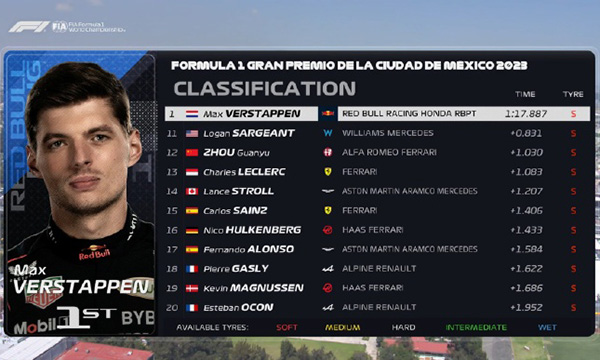 jrs直播网讯 北京时间10月29日,2023F1墨西哥城大奖赛三练最终成绩:维斯塔潘跑出1:17.887,包揽三次练习赛的头名。阿尔本落后0.070秒排名第二,威廉姆斯车队状态不错!主场车手佩雷兹位列第三,与维斯塔潘单圈有0.139秒的差距。