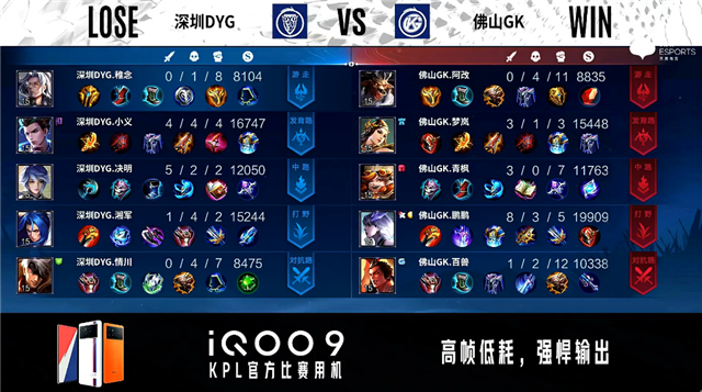 开局佛山GK边路换线。53秒佛山GK对抗路李元芳单杀吕布拿到一血。1分06秒佛山GK野区击杀太乙真人并反掉红BUFF。2分24秒对抗路双方1换1。3分36秒深圳DYG拿下主宰,团战佛山GK击杀吕布。6分16秒佛山GK对抗路击杀娜可露露。6分35秒中路团战佛山GK打出0换2。7分44秒主宰处团战深圳DYG打出0换2。9分02秒佛山GK拿下主宰。10分19秒佛山GK拿下暗影主宰。10分50秒佛山GK摧毁敌方对抗路二塔。11分11秒深圳DYG摧毁敌方中路外塔。12分15秒佛山GK摧毁敌方对抗路高地塔。12分24秒佛山GK发育路打出0换2。13分16秒深圳DYG野区击杀李元芳。14分22秒佛山GK拿下暗影主宰。15分06秒高地团战深圳DYG打出1换2。18分15秒主宰处团战佛山GK打出0换3。18分36秒佛山GK摧毁敌方水晶拿下比赛。