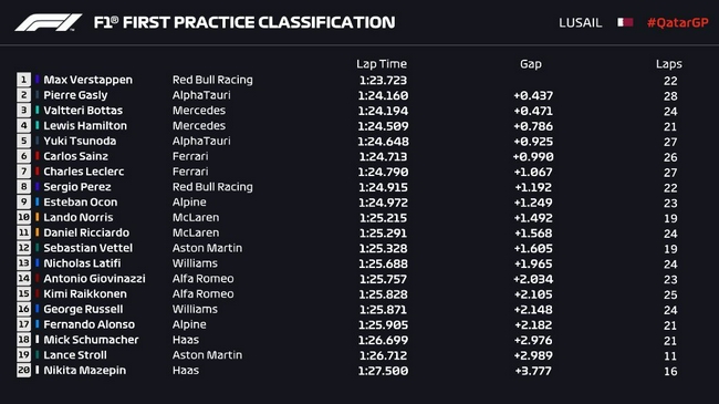 F1卡塔尔站FP1成绩表: