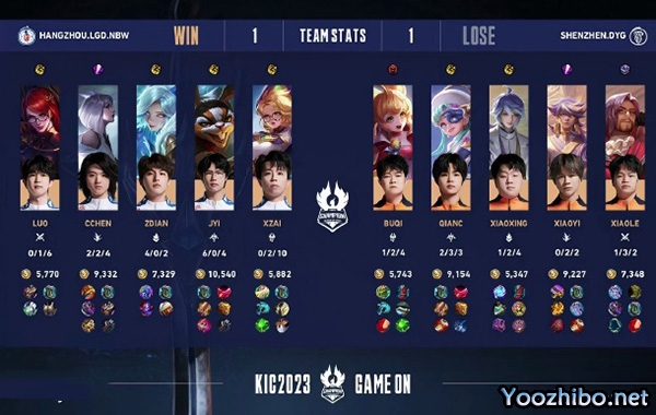开局双方平稳发育,并未爆发摩擦。时间过渡至四分钟,深圳DYG丶不弃 赞尼尔二技能击飞对方射辅二人,深圳DYG丶小义 祖卡及时切入击杀鲁班七号,拿到一血,随后深圳DYG众人跟上输出,收掉对方三人。五分三十秒,杭州LGD.NBW抓到对方伊格掉点,收掉人头并顺势推掉中路一塔。