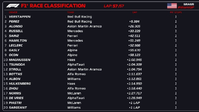 jrs直播网讯 2023年F1迈阿密大奖赛正式比赛结束,凭借超强的保胎表现,第九位发车的维斯塔潘最终率先冲线,收获本赛季个人的第三个分站冠军,同时他也连续两年在迈阿密大奖赛夺冠!他的队友佩雷兹亚军,红牛车队再次一二带回!阿斯顿马丁车队阿隆索季军,这也是他本赛季第四次登上领奖台。