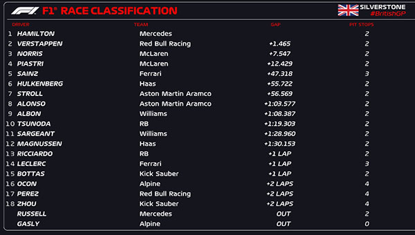 jrs直播网讯 北京时间07月07日,F1英国大奖赛正赛,汉密尔顿时隔2年半再夺冠,维斯塔潘、诺里斯分列二三,勒克莱尔、佩雷兹由于策略失误,仅排名第14和17,索伯继续整活,周冠宇四停第18,杆位起跑的拉塞尔退赛。