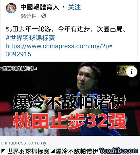 桃田贤斗无缘世锦赛16强,赛后有外媒的言论引发争议,这是马来西亚媒体赛后报道桃田贤斗赛果的时候表示:桃田去年一轮游,今年有进步,第二轮出局。”