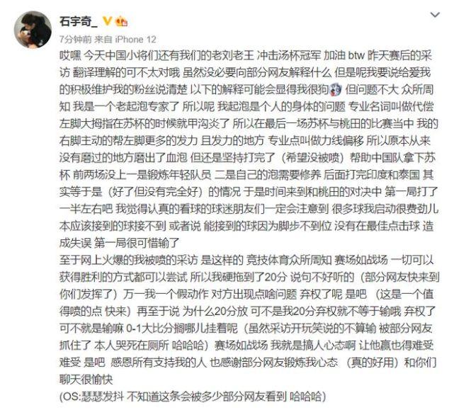 石宇奇在长文中表示,自己是真受伤了,左脚大拇指在打苏迪曼杯的时候就甲沟炎了,但即便如此,他还是咬牙坚持打完,最终击败桃田帮助国羽赢下了苏迪曼杯。到了汤姆斯杯赛场,尽管伤病有所缓解,但还是没有完全好。