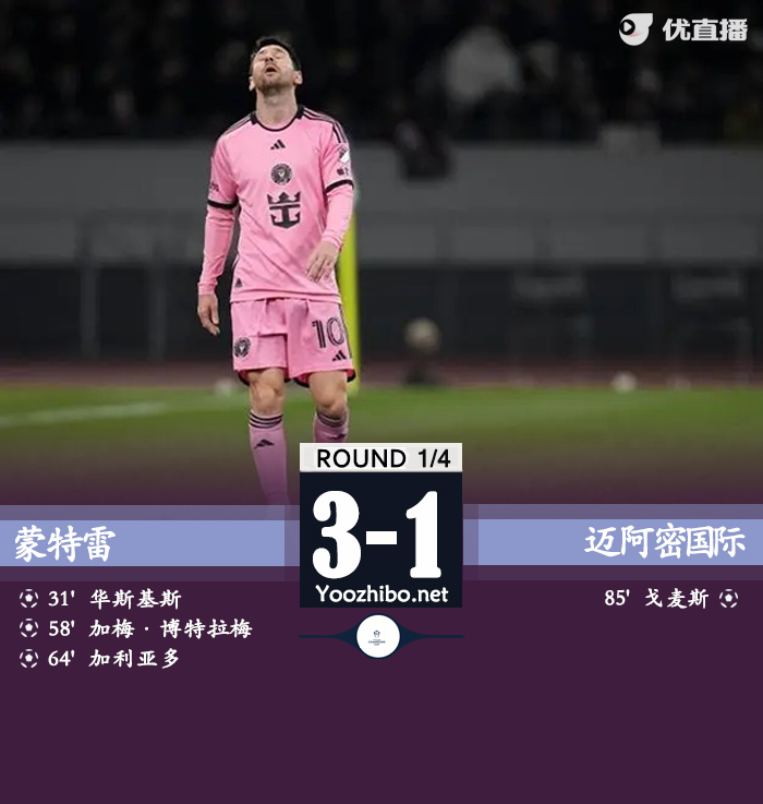 jrs直播网讯:北京时间4月11日美冠杯1/4决赛次回合,蒙特雷主场对阵迈阿密国际。比赛第31分钟,卡伦德超巨失误,巴斯克斯率先得分,第58分钟,贝尔泰拉梅世界波再下一城,第64分钟,蒙特雷前场断球,加利亚多头球得分,第78分钟,阿尔巴踩踏对手吃到第二张黄牌被罚下场,第85分钟,梅西助攻迭戈-戈麦斯扳回一城。最终比分蒙特雷3-1迈阿密国际。两回合总比分蒙特雷5-2迈阿密国际。