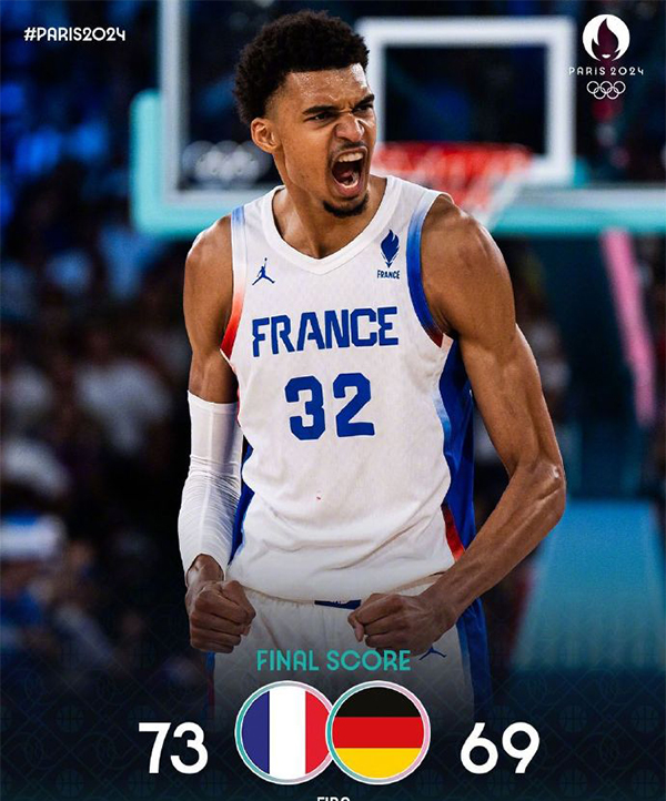 jrs直播网8月9日讯 奥运会男篮进入半决赛争夺,东道主法国迎战世界杯冠军德国男篮。两支同为B组的球队已经有过一次对决,当时德国男篮14分的优势击败法国男篮。首节开局德国男篮打出灵活的进攻,施罗德和小瓦格纳各自命中三分带队送出12-2的攻势抢占先机;法国在暂停回来后逐渐找到状态,但外线失准成为限制他们的关键,整个上半场他们三分球12投1中让局面很被动。不过好在他们防守端在线并成功遏制住德国男篮核心之一的施罗德,而整个第二节他们仅丢8分表现堪称完美,他们以此为基础在一度落后10分的情况下送出15-5的攻势扳平比分结束上半场。休息归来巴图姆的三分帮助法国男篮取得本场第一次领先,而他们三分手感稍稍回暖也帮助他们占据上风,末节文班亚马也在外线命中三分,士气大涨的法国10-3开局将优势扩大至两位数;顽强的德国在读秒阶段追至2分看到希望,不过德国最后时刻出现致命失误让出了绝平甚至绝杀球权,法国则在罚球大战中守住胜利。最终,法国男篮73-69力克德国男篮率先杀入决赛。