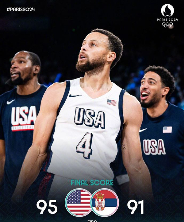 jrs直播网8月9日讯 奥运男篮半决赛,美国对阵塞尔维亚。比赛开始,库里火力全开3分钟砍下14分,但塞尔维亚多点开花强势回应,次节塞尔维亚连中三分将分差拉开到17分,美国男篮内外开花苦苦追赶,詹姆斯助攻库里飙中三分后自己打成2+1,但半场战罢美国队还是以43-54落后11分。易边再战,双方围绕两位数的分差展开激烈争夺,库里和霍勒迪连中三分,末节塞尔维亚命中率骤降,美国男篮利用防守反击不断蚕食分差,恩比德连得5分率队打出7-0扳平比分,双方争夺陷入白热化,关键时刻詹库合力连得7分完成反超,塞尔维亚后劲不足,最终,美国男篮完成17分的逆转,95-91挺进决赛。