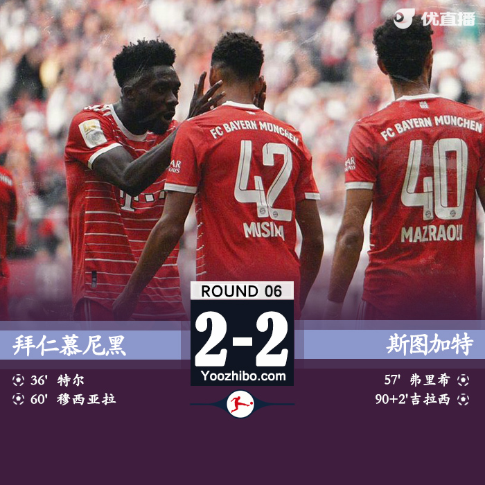 全场比赛结束,拜仁2-2战平斯图加特,遭遇三连平。