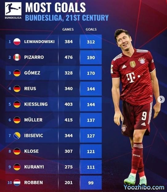 21世纪德甲进球+助攻榜:莱万312球75助