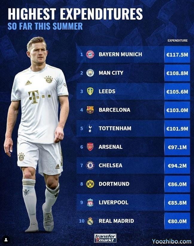 jrs直播网07月22日讯 今日,德转盘点了今夏转会市场中,到目前为止的各球队签人花销top10:拜仁1.175亿欧居首,利兹联进前三。