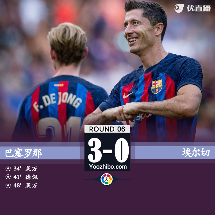 jrs直播网讯北京时间9月17日22:15,2022-23赛季西甲联赛第6轮,巴萨坐镇主场迎战埃尔切。上半场第14分钟,维尔杜被罚下,莱万破门,德佩建功,佩德里进球被吹,巴萨暂2-0十人埃尔切。易边再战,莱万再次破门,最终巴萨3-0十人埃尔切,先赛一场登上积分榜榜首。
