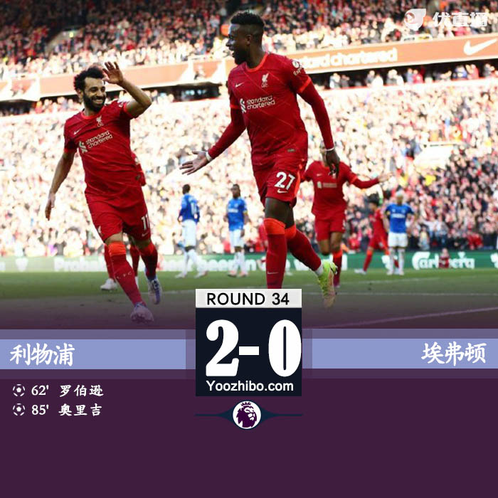 jrs直播网4月25日讯 北京时间4月24日23时30分,2021-2022赛季英超第34轮上演一场默西塞德德比战,利物浦主场迎战埃弗顿。上半场双方均无建树,利物浦半场0-0战平埃弗顿。下半场,萨拉赫助攻罗伯逊首开纪录,替补登场的奥里吉破门锁定胜局。最终利物浦主场2-0击败埃弗顿,取得联赛两连胜。此役战罢,利物浦继续排名第二,依旧落后领头羊曼城1分。