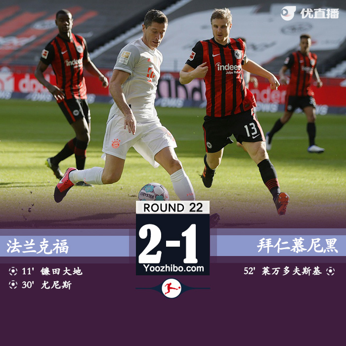 jrs直播网2月20日讯 北京时间2021年2月20日22:30,2020-21赛季德甲第22轮,拜仁慕尼黑客场挑战法兰克福。上半时镰田大地先开纪录,随后尤尼斯世界波破门,边裁因伤换人。下半时萨内助攻莱万破门,科曼错失良机。最终,法兰克福2-1战胜拜仁,拜仁两轮联赛不胜。