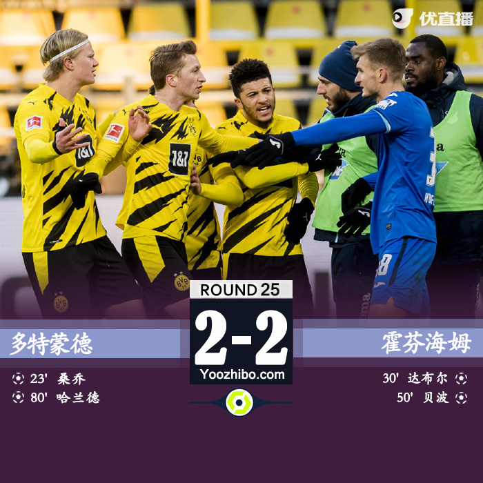 jrs直播网2月14日讯 北京时间2月13日22:30,德甲联赛第21轮,多特蒙德主场迎战霍芬海姆。上半场比赛,阿坎吉失误希茨救险,格雷罗助攻桑乔单刀破门,鲁迪助攻达布尔扳平比分。下半场比赛,希茨扑救失误贝布破门,哈兰德抽射扳平比分。全场比赛结束,多特2-2战平霍芬海姆。