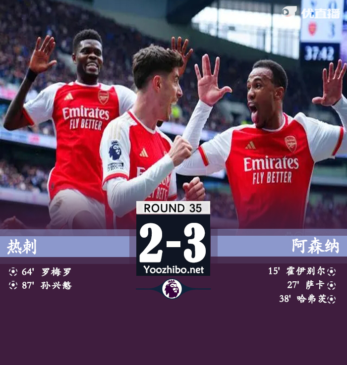 jrs直播网讯:北京时间4月28日晚21时整,2023-24赛季英超第35轮北伦敦德比在新托特纳姆热刺球场展开角逐,热刺坐镇主场迎战阿森纳,上半场萨卡破门+造霍伊别尔乌龙,哈弗茨传射&近2场3球,下半场拉亚失误送礼,赖斯送点,罗梅罗和孙兴慜连扳两球。最终阿森纳客场3-2险胜热刺,枪手取得联赛3连胜,热刺遭遇两连败。积分榜方面,枪手多赛2场以4分优势领跑,热刺位居第5,少赛2轮落后前四名7分。