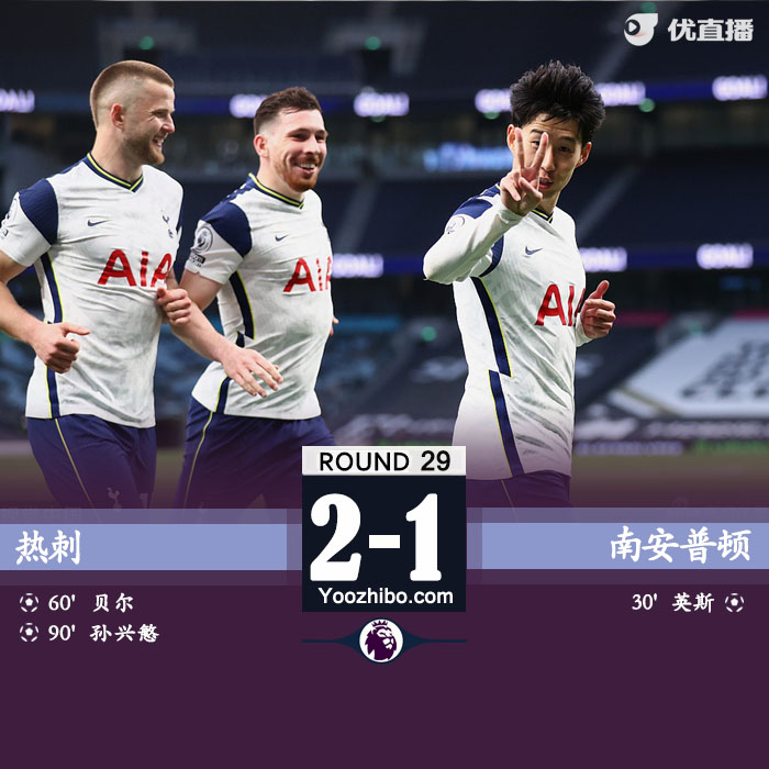 jrs直播网4月22日讯 北京时间4月22日凌晨1时,2020-2021赛季英超联赛第29轮的一场补赛展开角逐,热刺坐镇主场迎战南安普顿。上半场,丹尼-英斯头球破门,南安普顿半场1-0领先热刺。下半场,贝尔扳平比分,随后孙兴慜点球破门完成绝杀。最终热刺主场2-1击败南安普顿。