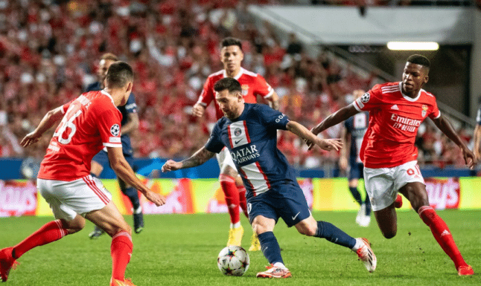 比赛中,梅西继续大放异彩,主导了大巴黎的整个中前场。比赛第21分钟,双巨内马尔、梅西一同建功,由内马尔在禁区弧顶为梅西送出一脚助攻,梅西斜插得球顺势不停球直接兜射破门,皮球直挂球门左侧死角,大巴黎1-0领先;比赛第40分钟,恩佐-费尔南德斯传中造险,禁区内的达尼洛-佩雷拉出现致命失误,直接将球碰进自家球门,曾2夺欧冠冠军的老牌豪门本菲卡1-1幸运追平比分。