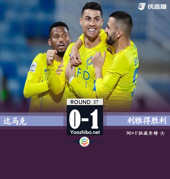 jrs直播网讯:4月6日,沙特联赛第27轮,达马克主场迎战利雅得胜利。上半场,两队均无建树。下半场,C罗替补出场,葡萄牙球星送出妙传,加里卜射门击中横梁弹出。随后,C罗的射门被后卫门线解围。补时阶段,布罗佐维奇开出角球,拉波尔特头槌上演绝杀。全场比赛结束,利雅得胜利1-0击败达马克。