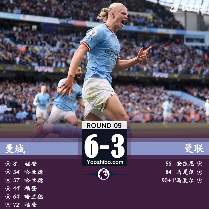 jrs直播网讯北京时间今天21:00,英超第九轮迎来焦点战,第188场曼市德比,曼城坐阵伊蒂哈德球场迎战曼联。上半场B席助攻福登破门,京多安任意球中柱,哈兰德头球破门后铲射破门完成双响,随后哈兰德助攻福登再下一城,半场曼城四球领先。下半场回来安东尼世界波扳回一城,哈兰德破门完成帽子戏法,随后哈兰德助攻福登进球完成帽子戏法,马夏尔门前补射破门,终场前坎塞洛送点,马夏尔点射完成双响。全场结束曼城6-3击败曼联拿下第188次曼市德比的胜利。