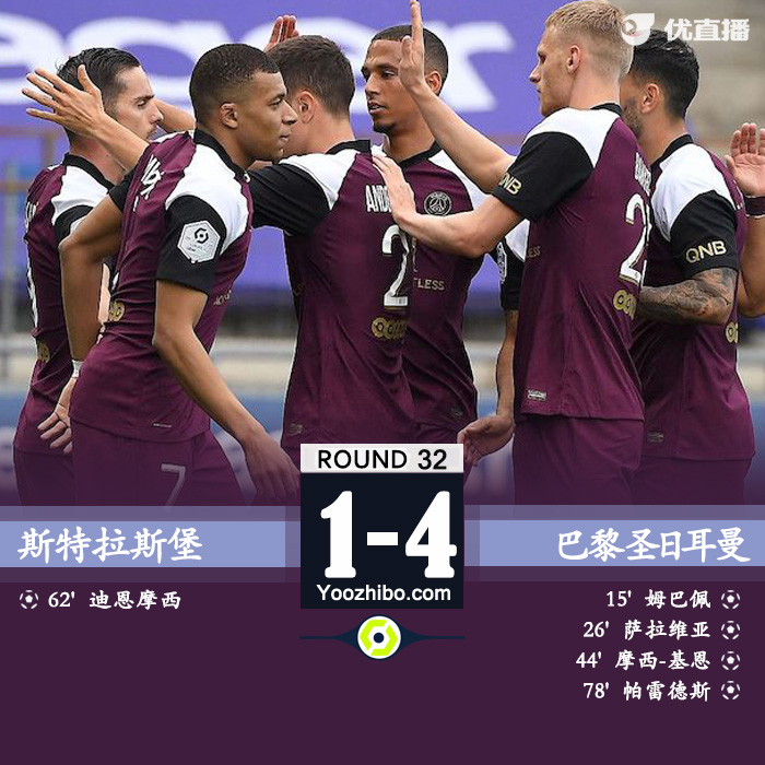 jrs直播网4月11日讯 北京时间4月10日23:00,2020/21赛季法甲联赛第32轮,斯特拉斯堡对阵巴黎圣日耳曼的比赛继续进行。上半场姆巴佩低射破僵,萨拉维亚再下一城,半场前小基恩再入一球。下半场萨希替补登场扳回一球,帕雷德斯世界波锁定胜局。全场比赛结束,最终巴黎4-1战胜斯特拉斯堡,仍落后榜首3分。