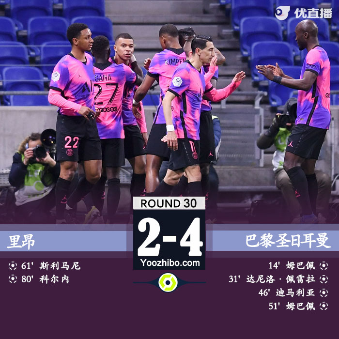 jrs直播网3月22日讯 北京时间03月22日星期一04:00,法甲第30轮里昂主场迎战巴黎圣日耳曼。上半场,姆巴佩首开记录,达尼洛扩大比分。下半场迪马利亚任意球直接破门,姆巴佩完成双响,斯利马尼和科内特破门。最终,巴黎4-2里昂登顶。