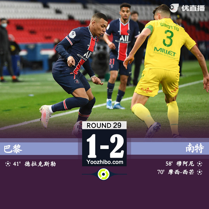 jrs直播网3月15日讯 北京时间03月15日星期一04:00,法甲第29轮巴黎圣日耳曼主场迎战南特。上半场,德拉克斯勒破门,巴黎半场1-0领先南特。下半场,姆巴佩回传失误送礼,穆阿尼传射,西芒反超比分。最终,巴黎主场爆冷1-2遭南特逆转。