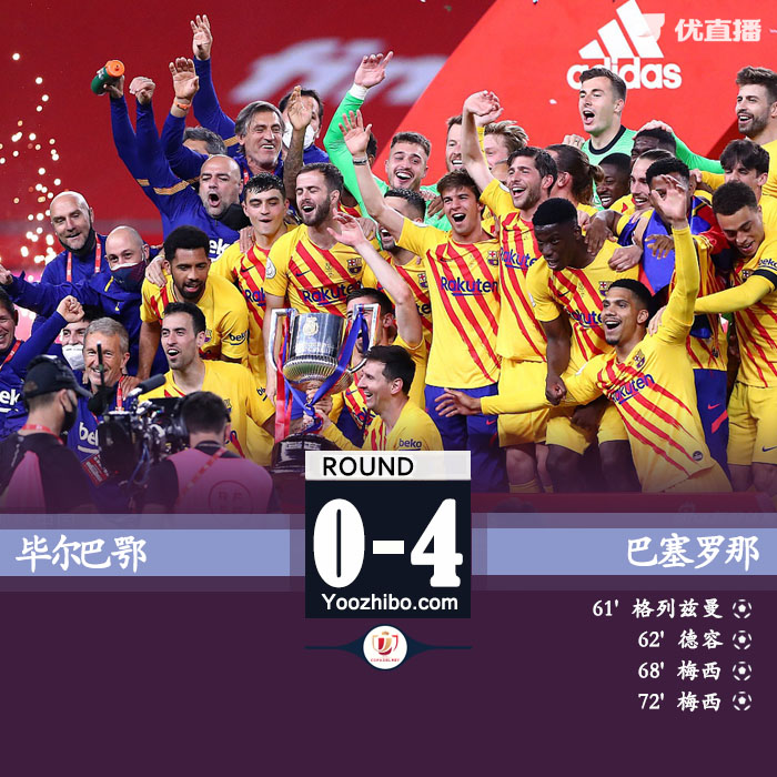 jrs直播网讯:北京时间4月18日03:30,2020-2021西班牙国王杯决赛,巴塞罗那对阵毕尔巴鄂竞技。上半场巴萨获得绝对控球优势,德容推射中柱。下半场格列兹曼、德容短时间内连进两球,梅西随后梅开二度。最终,巴萨4-0毕尔巴鄂竞技夺冠。