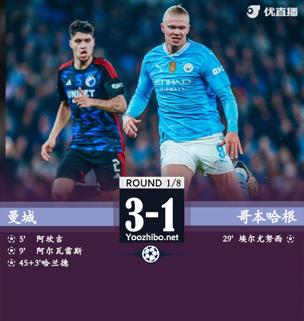 jrs直播网讯 北京时间3月7日凌晨4:00,2023-24赛季欧冠1/8决赛次回合,曼城坐镇伊蒂哈德球场迎战哥本哈根,首回合蓝月亮3-1获胜。上半场阿尔瓦雷斯开场9分钟传射建功,阿坎吉破门,埃尔尤努西扳回一球,补时阶段哈兰德进球,曼城暂3-1哥本哈根;下半场努内斯摔倒导致手指90°弯折受伤,随后被换下,两队都没有再改写比分,最终曼城3-1哥本哈根,总比分6-2晋级1/4决赛。