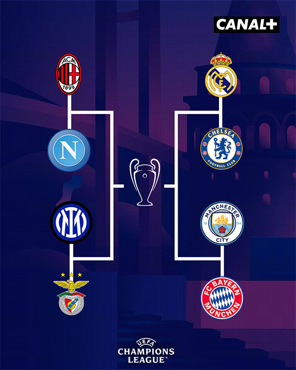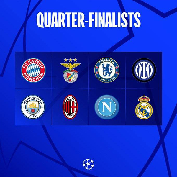 2022-23赛季欧冠八强:切尔西(英超)、曼城(英超)、AC米兰(意甲)、国际米兰(意甲)、那不勒斯(意甲)、皇马(西甲)、拜仁(德甲)、本菲卡(葡超)。