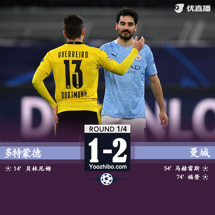 jrs直播网4月15日讯 北京时间4月15日凌晨3点整,2020-21赛季欧冠1/4决赛次回合在伊杜纳信号公园球场展开角逐,多特蒙德坐镇主场迎战曼城。上半场贝林厄姆首开纪录,德布劳内中框,下半场埃姆雷-詹送点,马赫雷斯点射扳平,福登爆射反超比分。最终曼城客场2-1战胜多特蒙德,总比分曼城4-2淘汰多特晋级四强,曼城半决赛将对阵巴黎圣日耳曼。