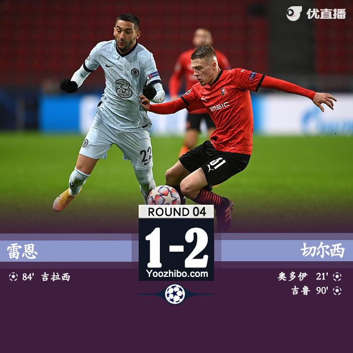 全场比赛结束,切尔西客场2-1击败雷恩。