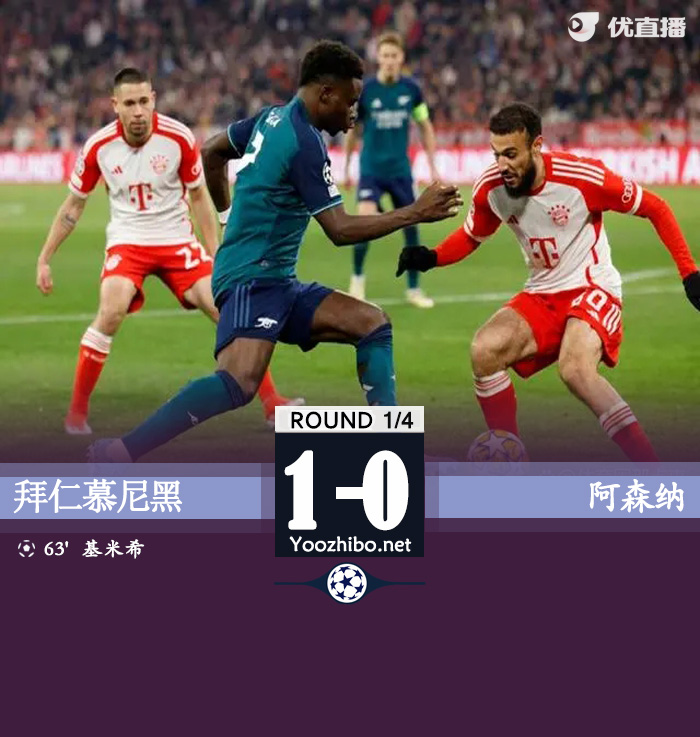 jrs直播网讯:北京时间4月18日欧洲冠军联赛 1/4决赛次回合,拜仁慕尼黑主场对阵阿森纳。凯恩开场连续打门造险,穆西亚拉远射被扑,马丁内利推射被诺伊尔没收,下半场格雷茨卡和格雷罗先后中柱,基米希头球冲顶破门。最终比分拜仁 1-0 阿森纳。两回合总比分拜仁3-2阿森纳。