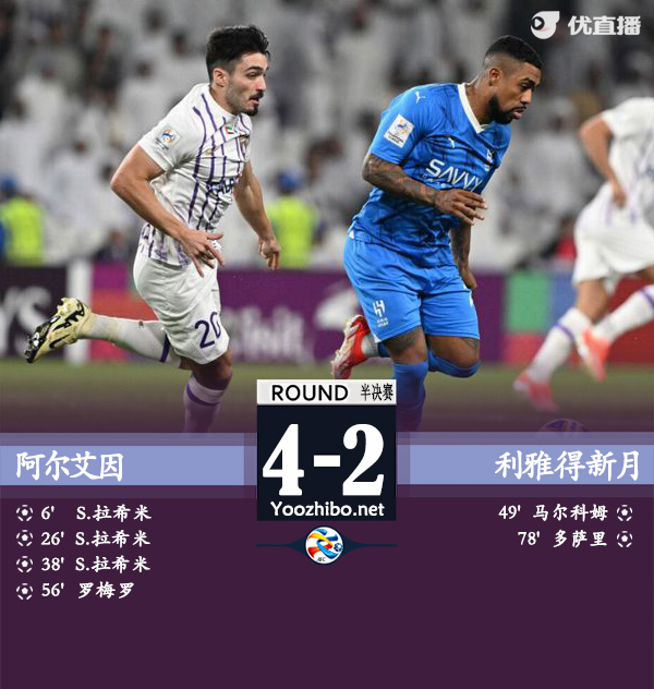 jrs直播网讯:北京时间4月18日亚洲足球冠军联赛 半决赛首回合,艾因主场对阵利雅得新月。上半场刚开始,纳迪尔送出助攻,拉希米前插推射远角破门先拔头筹,哈姆丹禁区转身小角度抽射被挡出,拉希米和埃里克先后制造点球,拉希米操刀点射完成帽子戏法,下半场米林科维奇助攻马尔科姆破门扳回一城,拉希米又一次制造点球,卡库点射命中,尾声阶段达瓦萨里门前轻挑转身完成破门,全场战罢,最终比分艾因 4-2 利雅得新月。