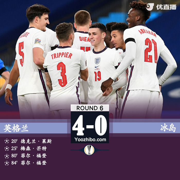 jrs直播网讯:北京时间11月19日03:45(英国当地时间18日19:45),2020/21赛季欧国联A组第2小组第6轮一场焦点战在温布利大球场展开争夺,英格兰主场4比0大胜冰岛,莱斯和芒特进球,福登梅开二度。英格兰终结连败,冰岛全负垫底。这是两队第5次交锋,此前英格兰取得2胜1平1负。马奎尔、福登和萨卡轮换出场。