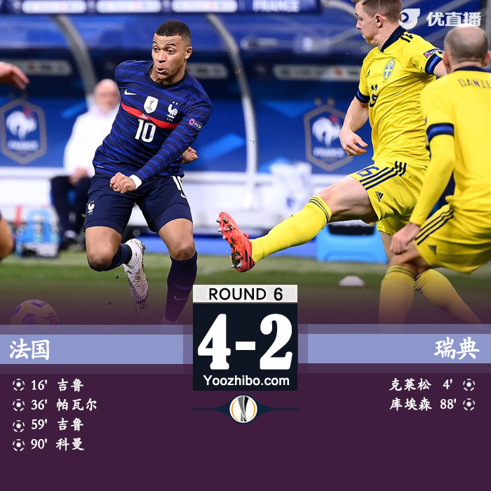jrs直播网讯:北京时间11月18日03:45(法国当地时间17日20:45),2020/21赛季欧国联A组第3小组第6轮一场焦点战在法兰西大球场展开争夺,法国主场4比2力克瑞典,吉鲁梅开二度,帕瓦尔和科曼进球。法国不败战绩夺得小组头名。