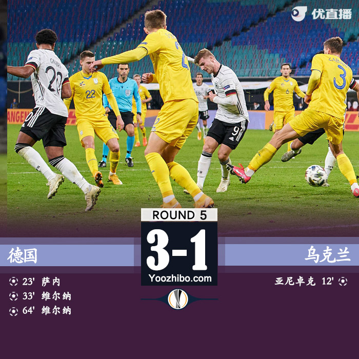jrs直播网讯:北京时间11月15日凌晨3:45,2020年欧国联小组赛第5轮继续进行,A级D组之中,在莱比锡红牛竞技场,德国队主场迎战乌克兰队。上半场,亚伦丘克打破僵局,格雷茨卡两次助攻,萨内和维尔纳破门反超比分,德国2-1领先乌克兰。下半场,维尔纳实现梅开二度,而津琴科、马罗斯和莫拉斯射门分别中柱。最终,德国队3-1逆转乌克兰。5轮战罢,德国队2胜3平拿到9分,由于西班牙本轮1-1战平瑞士,德国队以1分优势反超西班牙,位居小组第一。