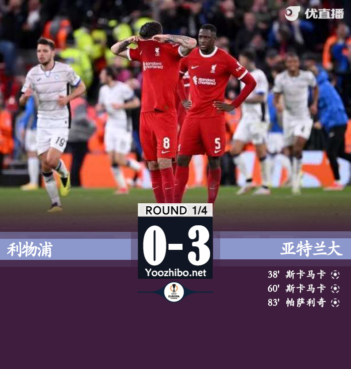 jrs直播网讯:北京时间4月12日欧联 1/4决赛首回合,利物浦主场对阵亚特兰大。开场凯莱赫神级扑救,努涅斯丢单刀,埃利奥特中框,斯卡马卡禁区推射破门,下半场斯卡马卡梅开二度,萨拉赫破门被吹,帕萨利奇锁定胜局。最终比分利物浦 0-3 惨败亚特兰大。