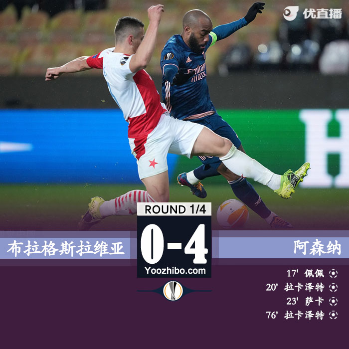 jrs直播网4月16日讯 北京时间04月16日星期五,03:00欧联杯1/4决赛次回合布拉格斯拉维亚迎战阿森纳。上半场,佩佩、拉卡泽特、萨卡先后破门,史密斯罗助攻表现抢眼,阿森纳半场3-0领先布拉格斯拉维亚。下半场,拉卡泽特再入一球完成双响。最终,阿森纳客场4-0总比分5-1布拉格斯拉维亚晋级,半决赛将对阵比利亚雷亚尔。