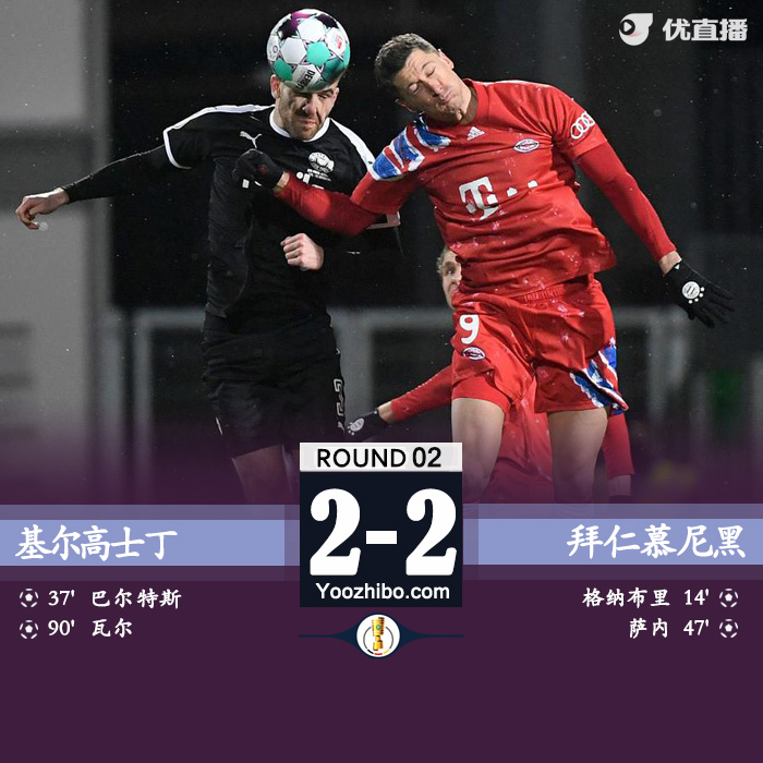 jrs直播网讯 北京时间1月14日凌晨3时45分,德国杯第二轮打响,拜仁对阵德乙球队基尔。第14分钟,格纳布里为拜仁首开纪录,第37分钟基尔由巴特尔斯反击扳平比分。易边再战,第47分钟萨内任意球直接破门,补时第3分钟瓦尔头球绝平。加时赛双方均未能完成进球,点球大战中双方前5罚均命中,罗卡罚丢第6粒点球。最终,拜仁总比分7-8不敌基尔,止步德国杯次轮。